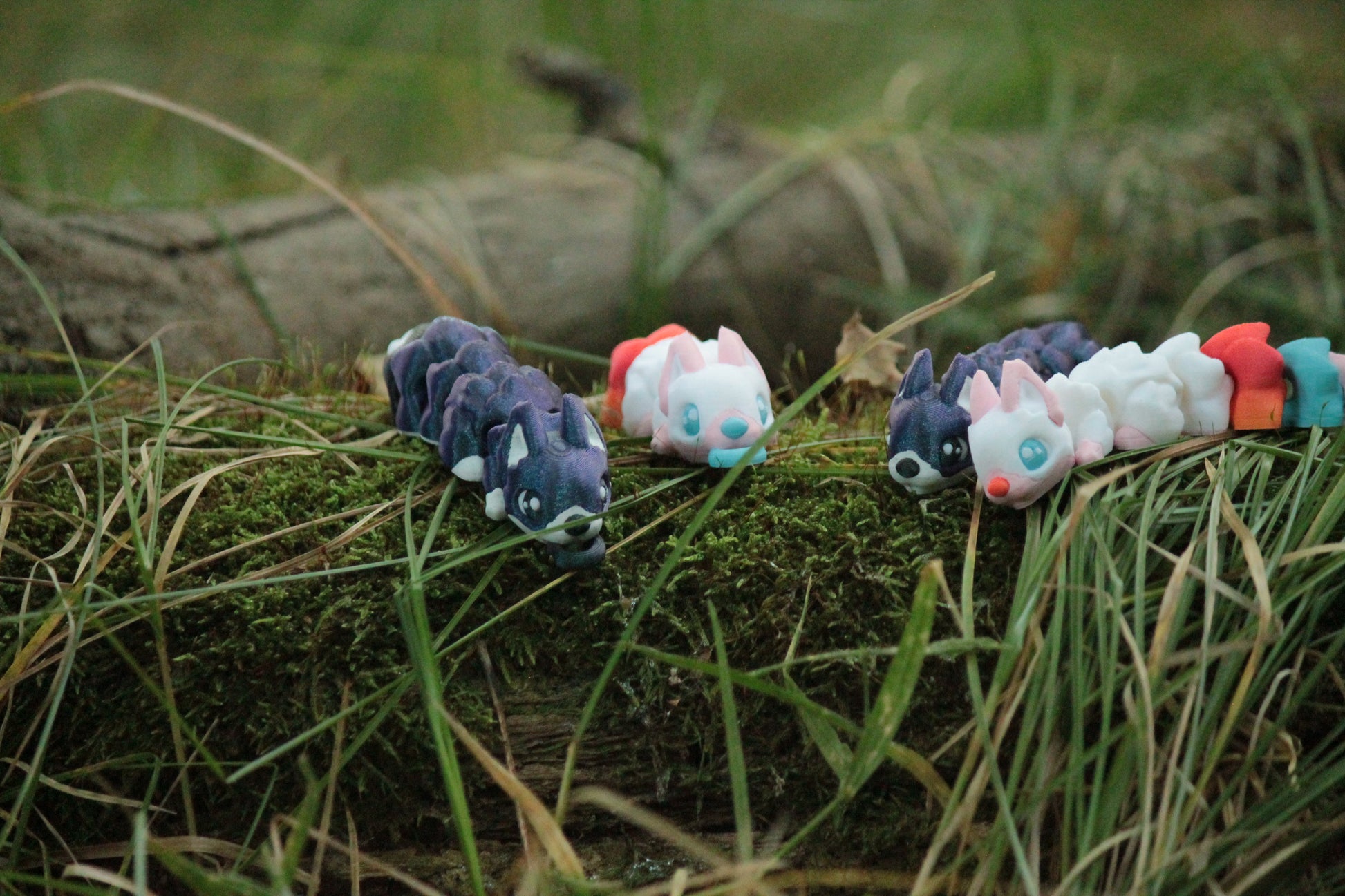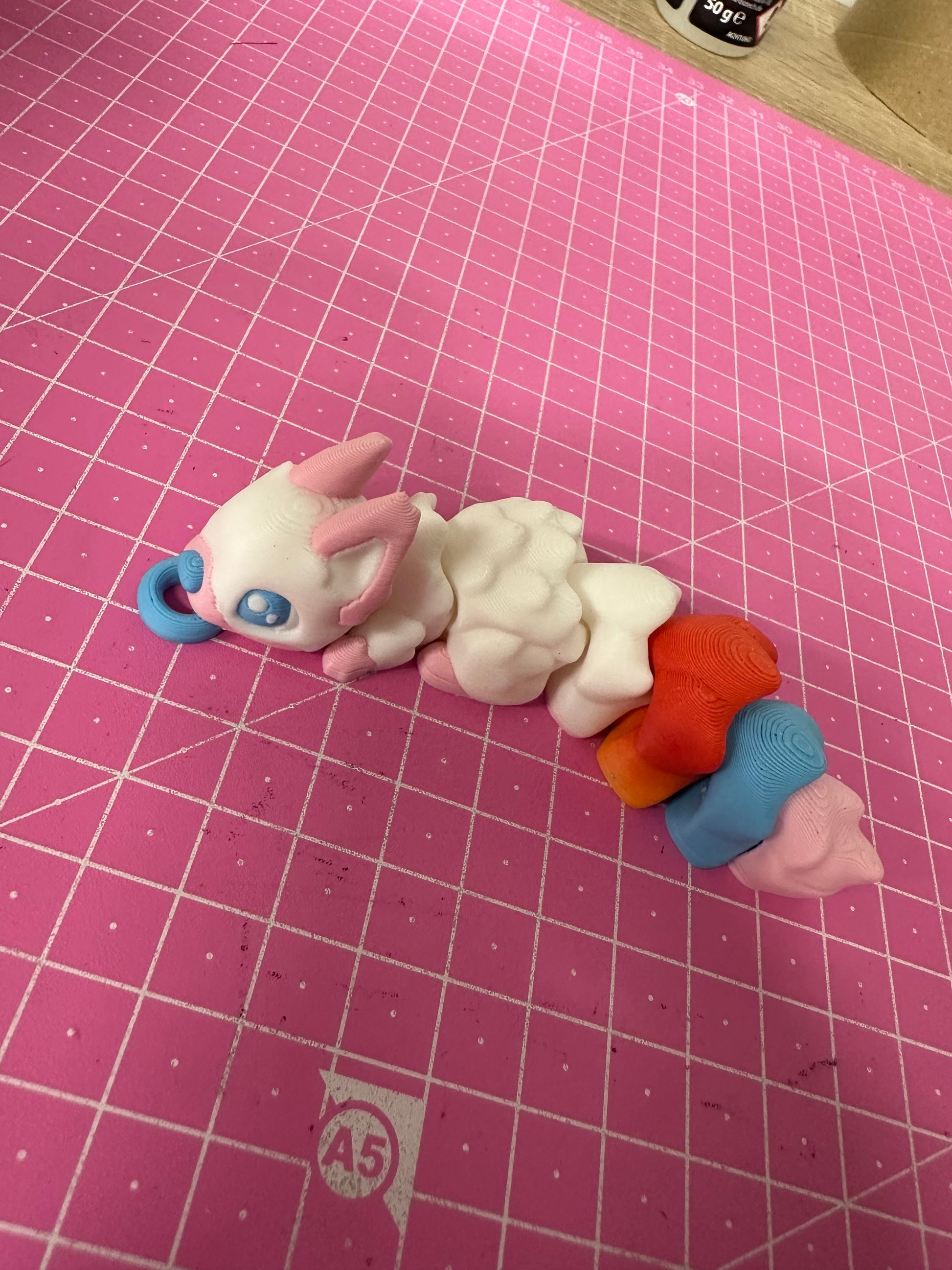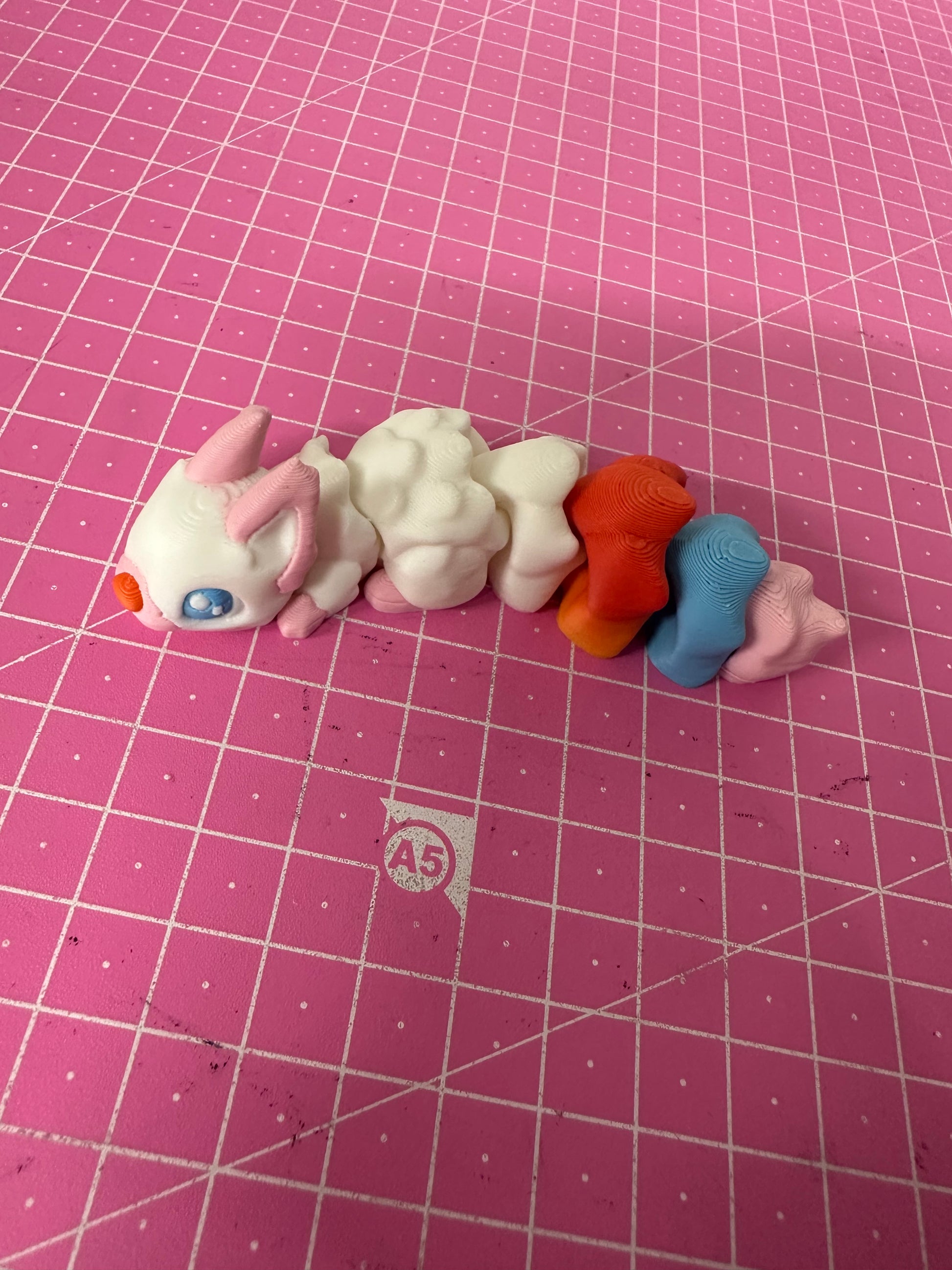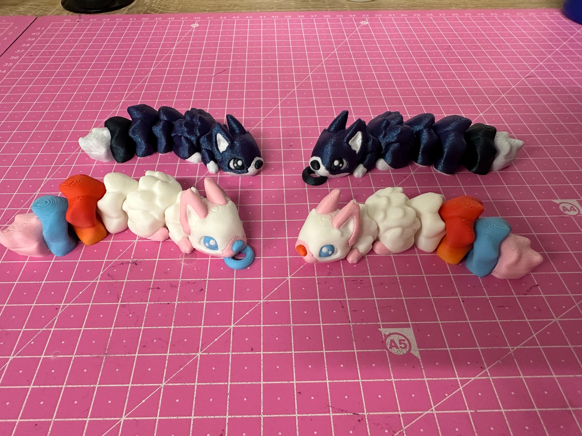 Der Farbverlauf ist nicht steuerbar und fällt bei jedem Druck unterschiedlich aus – manche Figuren zeigen mehr Rosa, andere mehr Blau, Grün oder andere Farbtöne.